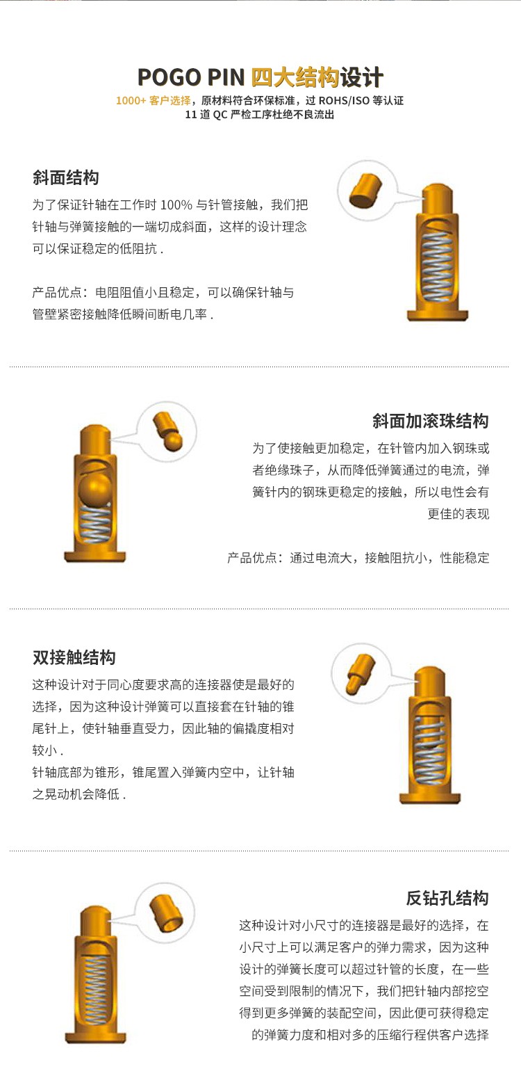 双盟电子工程师设计的斜面加滚珠结构就可以很好的实现大电流的充电连接方案,这种pogopin大电流结构优点通过电流大,接触阻抗小,性能稳定,目的是为了使接触更加稳定,在针管内加入钢 珠或者绝缘珠子,从而降低弹簧通过的电流,弹簧针内的钢 珠更稳定的接触,电性会有更佳的表现。