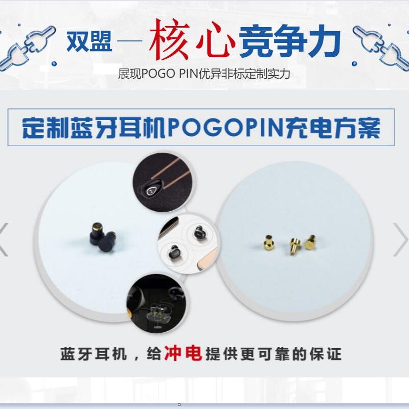 {pogopin充电弹簧针}生产厂商+[东莞双盟],免费提供解决方案,0方案设计费,外形款式客制化,提升客户产品整体档次及卖点,10年源头生产厂家,8项结构实用新型专利,提供特殊非标准件定制,10年连接器行业生产厂家,设计+生产一站式供应链服务 ,工厂面积10000平米,无尘净化车间,3000K/月产能,出货无忧,10年准时交货每一单。