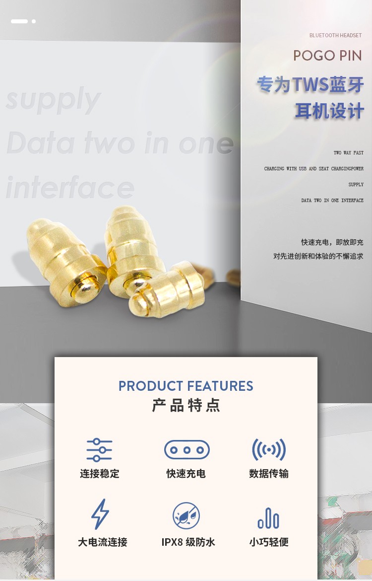 TWS耳机充电仓内的pogo pin单针连接器有两个主要用途,不仅可以给充电盒中的电池充电,还可以利用充电盒中电池的升压输出给耳机充电,pogopin弹簧顶针还可以防止内置锂电池过充、过放、短路、过流等保护功能,实现持久续航的功能。