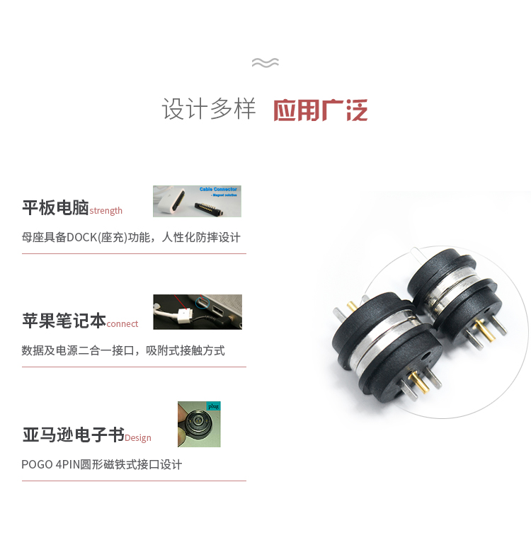 磁吸数据线的免插拔防摔轻附秒吸功能是自吸磁充电数据线的一大亮点,人性化防摔设计,数据及电源二合一接口,吸附式接触方式,有圆形、方形、跑道形、异形多种外形款式设计,满足不同电子产品市场需求。