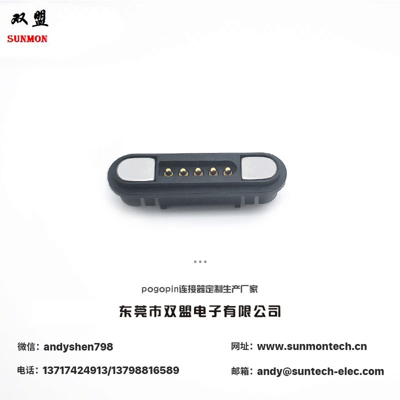 双盟电子自主研发的这款5pin公母座磁吸连接器带卡扣磁铁机构双电路保护,尾部折弯用格栅隔开防止尾部转动,磁铁后部采用卡扣方式防止磁铁掉出,采用磁铁的特性S和N端相吸相斥防呆,外形防呆,一边圆弧另一边直角防呆。