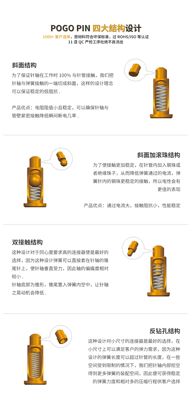 磁吸式的数据线接口有很多种,其中比较广泛的就是弹簧针连接器了,触点式的连接,在加上磁吸式的设计,使其在接入上更便捷,寿命也更长久,在一些工业平板、电子穿戴、医用美容等行业中较为常见,其与其它连接器的区别就是,弹簧针可轻易的实现上万次的拔插寿命,部分特殊结构的甚至可以实现数十万次。