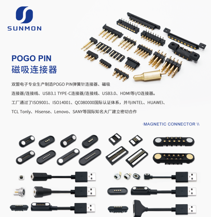 弹簧针和磁吸连接器,应用较多的便是在智能电子设备上了,尤其是磁吸式的设计,非常符合智能便捷的理念。双盟电子连接器开发设计厂商,具备研发、生产、销售、售后服务于一体的源头厂家。