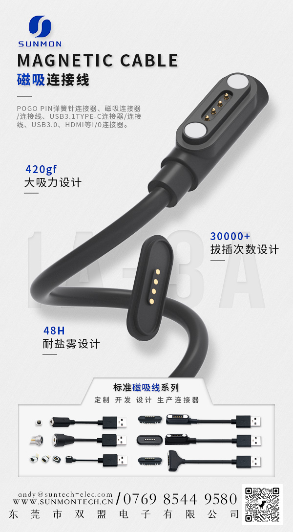 从消费电子产品到工业电子,再到现在新能源车,越来越多的企业已经开始选用pogopin磁吸数据线,这一类型的连接器每次在连接时,都不需要精准的去连接接口,尤其是一些连接不方便的时候,只需在结构上略微辅助,就能够快速完成的可靠连接,这个是其它连接器所难以实现的。