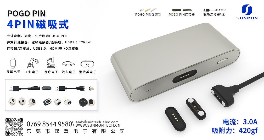 pogo pin磁吸防水连接器的开发,是双盟电子近几年所创新的方向,为满足越来越多的智能电子设备,提升产品的连接速度,双盟电子开发了众多磁吸式的连接器,均可以实现自动吸附,并且在电流上可达到30A的大电流,十几年的弹簧针连接器生产经验,帮助上千家企业解决过连接方案。