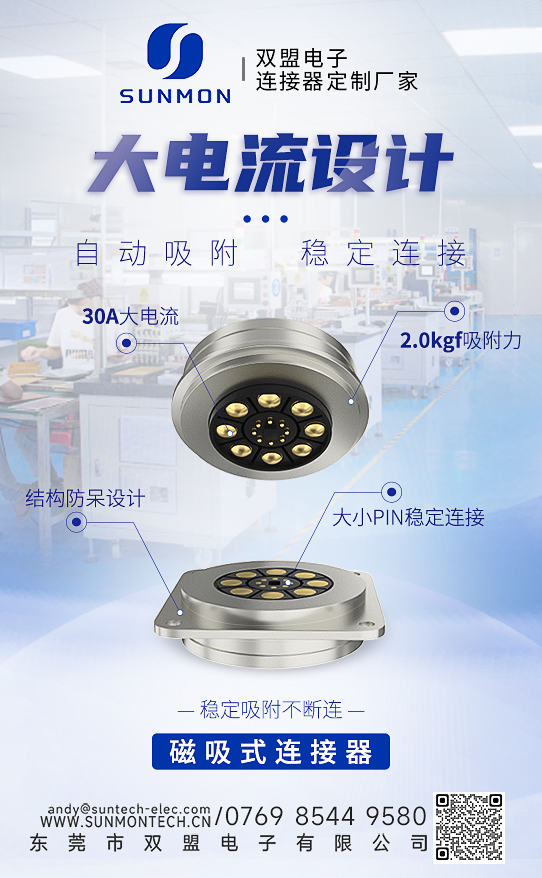 由双盟电子研发的pogopin大电流方案,注意到市面上很多连接器会存在大电流传送时,导致系统发热,传送不稳定,寿命等诸多问题,所以这款能过30A 的大电流连接器,不但配备2.0kgf的磁吸力吸引,保障可靠,即使是一些摇动,也难以让其分离,产品都通过多方面验证,并经过严格的检测。