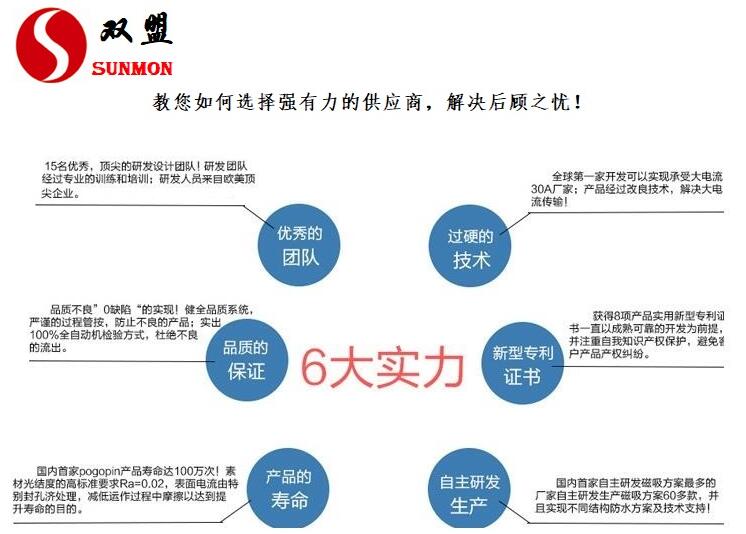 双盟Sunmon12年专业生产定制pogopin连接器,弹簧针连接器,单双排连接器,发丝级工艺,不卡pin,不掉pin,支持大电流闪充,数据传输稳定不断联,使用寿命长,2241余款标准品任选,所有产品材料均符合ROHS无卤环保要求,通过SGS检测。