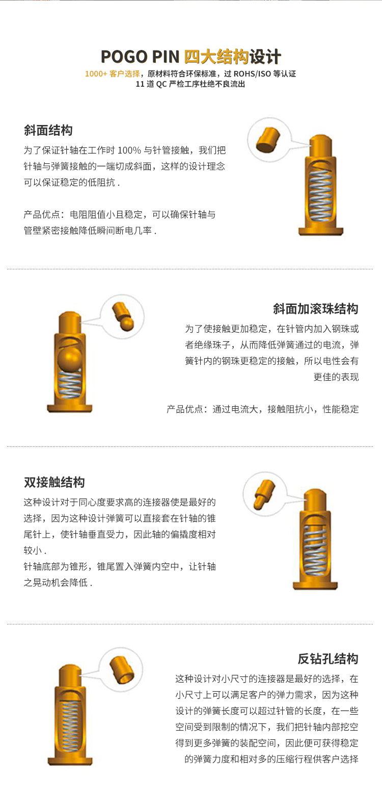 镀金加工工艺在pogopin连接器电镀工艺中占据显著关键的影响力,通常pogopin镀金越厚效果越好,单价越高,所以镀金厚度跟Pogopin的成本有直接的关系,市面上常用的pogopin镀金厚度一般是3u",现在很多客人考虑成本镀金1u"也有在使用了,其实 3u"和1u"在使用寿命上,压缩可靠性上没有太大的差异,只是镀金层厚盐雾和耐磨要好一些,这两种厚度的盐雾Pin针的针头分别可以过48小时和24小时。