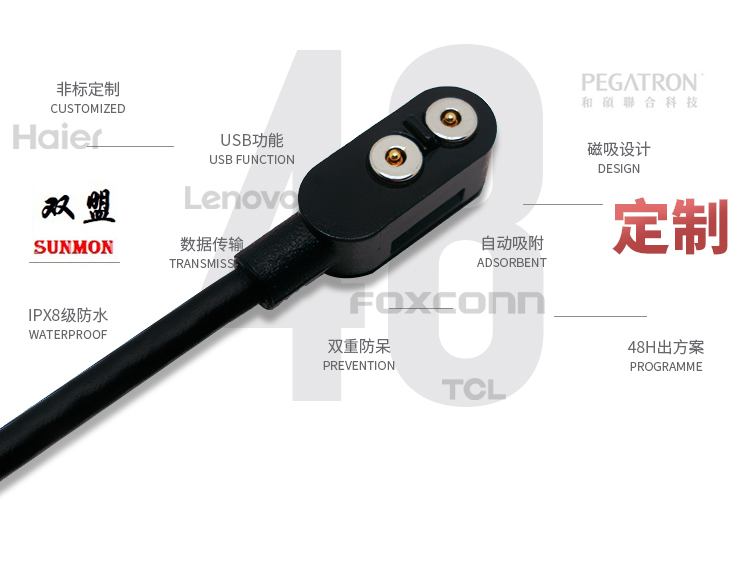 双盟SUNMON专业磁吸充电线解决方案商,1V1定制,磁吸结构设计双电路保护,闪充提速,48h出方案,7天出样,不平衡点面接触设计,防水防尘,1000客户共同见证认可双盟的服务和实力,双盟永远以客户为核心。