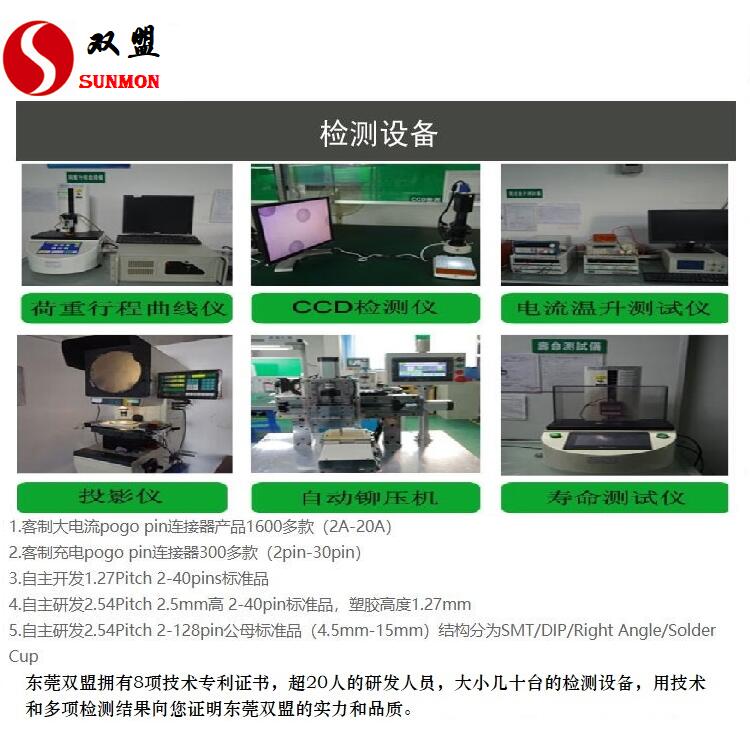 pogopin大电流弹簧探针源头生产厂家,8项结构实用新型专利,10年连接器行业经验,设计+生产供应链一站式服务 。工厂面积10000平米,无尘净化车间,3000K/月产能。免费提供产前风险评估,降低客户风险系数,镜面车削,发丝工艺,按压顺畅,不卡pin,无异响,,工业耐腐蚀等级,适应各种恶劣环境,8项结构实用新型专利,11道QC严检工序,杜绝不良品流出,交货准时,从业10年准时交货每一单。